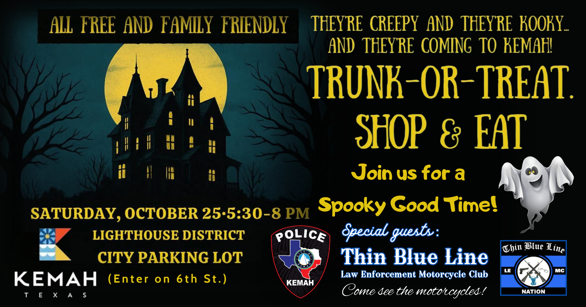 604 Bradford Ave, Kemah, TX 77565 604 Bradford Ave., Kemah, TX, United StatesJoin the Kemah Police Department for a Spooky Good Time at our annual Trunk or Treat. There will be a lot to see and do with lots of candy being handed out to our Trunk or Treaters. We have many special guests coming out including the Thin Blue Line Law Enforcement Motorcycle Club. Come check…